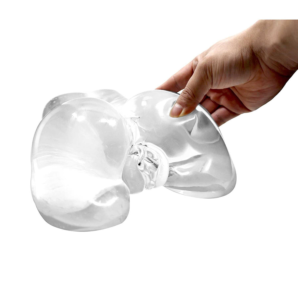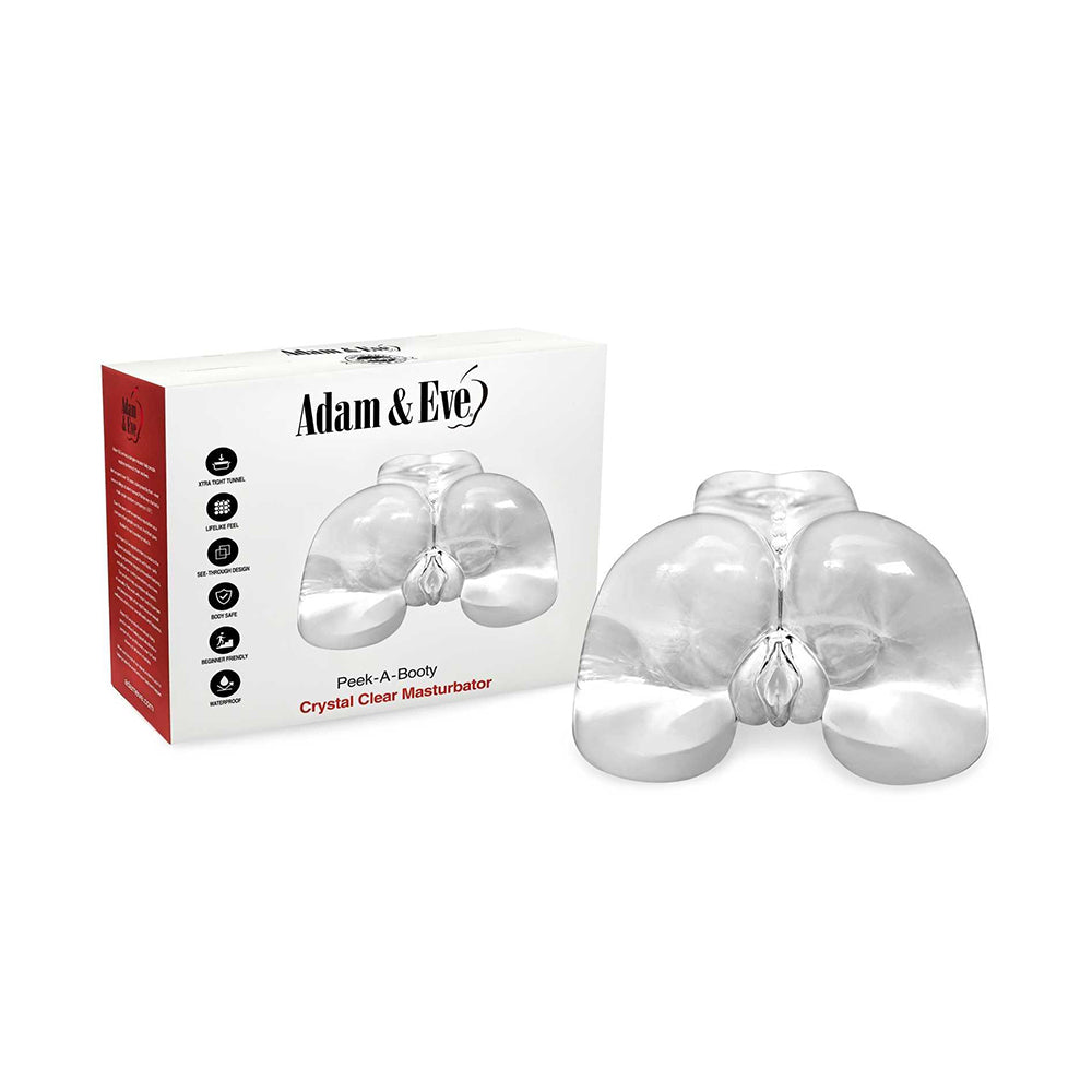 Witness ALL the hot action with the Peek-A-Booty Masturbator! Crafted using a revolutionary new process, this is the largest see-through masturbator we've ever sold. The crystal-clear material gives you an up close and personal look at every thrust. Its dual vaginal and anal entries bring your fantasies to life, as the tight, textured interior works every inch of your hard shaft. The durable construction and open-ended design deliver night after night of unbeatable pleasure. Measures 7.75 by 7.5 inches total with a 5.5-inch tunnel. Made from soft, see-through TPE.